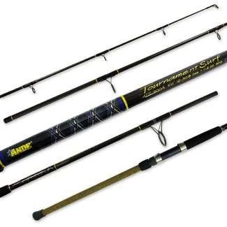 ANDE ATS Tournament Surf series of two piece, saltwater spinning rods offer hand crafted, custom quality look and high performance tapers. All of the full length, blank-through-handle construction models are crafted of light, powerful high modulus graphite with an added layer of high modulus carbon fiber for enhanced action, improved casting performance and superior sensitivity. Light, durable EVA foregrips and cork tape butt grips on all models keep the rods light while assuring comfort and toughness. Hardloy-style guides are mounted in corrosion proof stainless steel frames for line protection, wear resistance and light weight. Strong, powerful action blanks can handle both bait and lure fishing duties for long distance casting and the power to handle trophy fish in a light and tough surf rod.