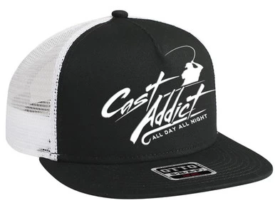 The David Dunleavy Cast Addict Trucker Hat is a 5-panel hat made with 100% cotton front/100% polyester mesh back. It features a Cast Addict logo design across the front.