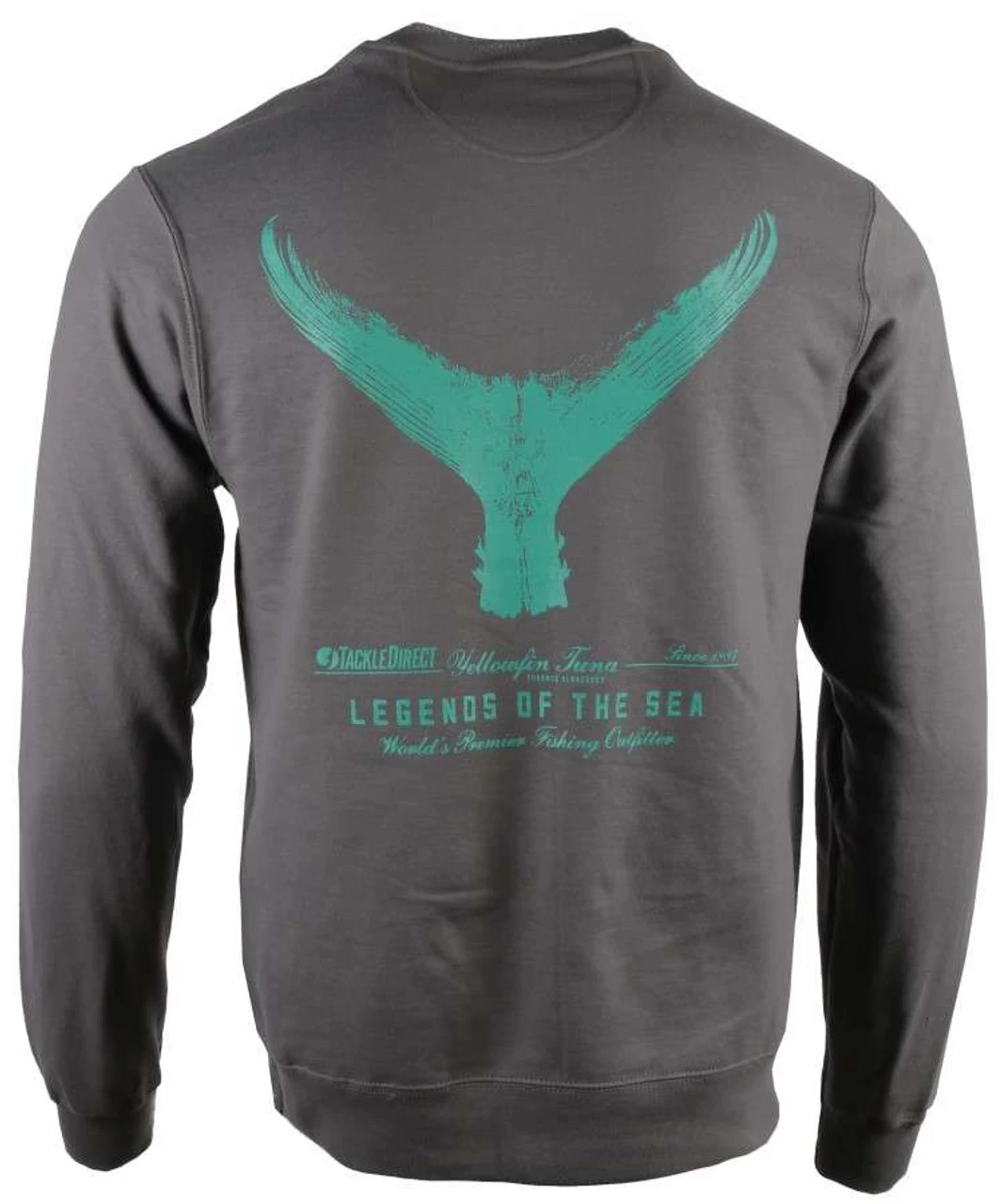 The TackleDirect Yellowfin Tuna Crewneck Sweatshirt keeps you warm and comfortable while being able to perform. Perfect for cold weather environemnts whether out on the boat or out on the town. Made from 9-ounce, 50/50 cotton/poly fleece and has the classic TackleDirect logo on the front chest and a Yellowfin Tuna Tail design on the back.